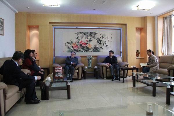 2014-03-313月25日下午,臺灣銘傳大學(xué)副校長(cháng)王金龍、法學(xué)院教授林動(dòng)髪、大陸教育交流處副處長(cháng)蕭耀文、教務(wù)處招生中心主任闕淑茹及財務(wù)金融主任盧陽(yáng)正一行應邀來(lái)oety歐億交流訪(fǎng)問(wèn)。