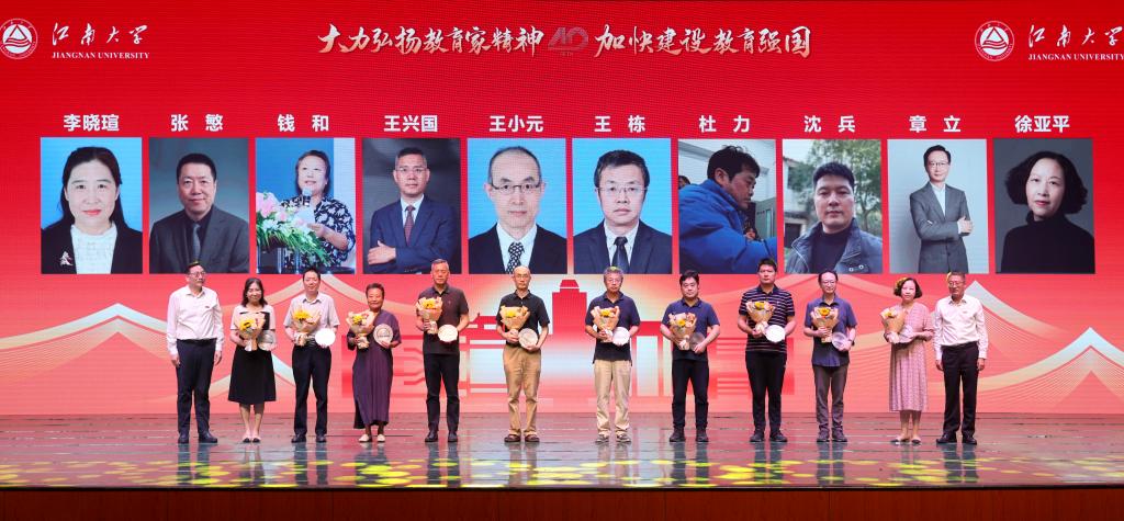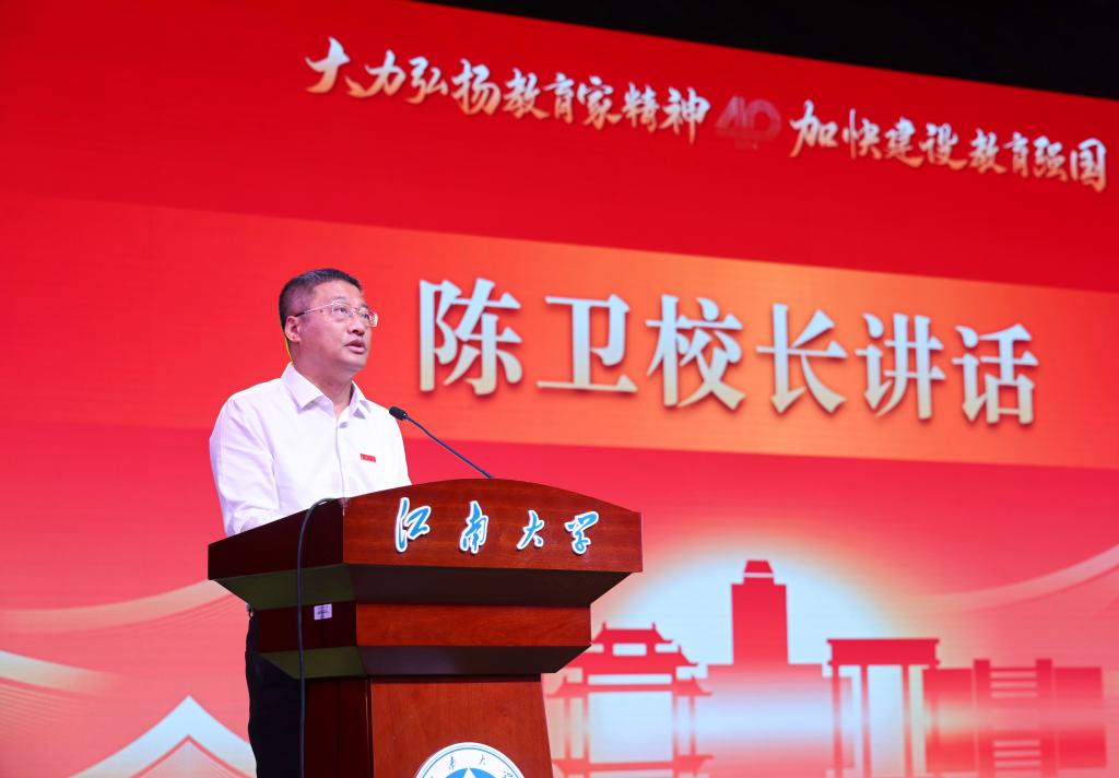 陳衛在總結講話(huà)中充分肯定了一年來(lái)全體教師所付出的辛勤努力和取得的豐碩成果。圍繞“大力弘揚教育家精神,加快建設教育強國”主題,殷切希望廣大教師堅定理想信念,做“明道信道”的鑄魂之師,胸懷“國之大者”,自覺(jué)肩負教育強國建設的時(shí)代重任,以高度的社會(huì )責任感和深厚的愛(ài)國情懷筑牢教育強國根基,更好擔起學(xué)生健康成長(cháng)指導者和引路人的責任。潛心教書(shū)育人,做“立德躬行”的模范之師,嚴格落實(shí)師德師風(fēng)第一標準,講好身邊榜樣教師的動(dòng)人事跡,見(jiàn)賢思齊、擇善而從,爭做“四有好老師”,用真心、真情、真誠關(guān)愛(ài)學(xué)生,用知識、學(xué)識、見(jiàn)識照亮學(xué)生心靈,為學(xué)生扣好“第一??圩印?,彰顯榜樣的力量。不斷提升自我,做“業(yè)精善學(xué)”的創(chuàng )新之師,樹(shù)立終身學(xué)習的理念,以學(xué)生成長(cháng)為中心,把握教學(xué)學(xué)術(shù)創(chuàng )新規律,著(zhù)眼世界學(xué)術(shù)前沿和國家重大需求,推動(dòng)科教產(chǎn)教融合、教學(xué)改革、課程改革,以有溫度的教育培養有引領(lǐng)力的學(xué)生,更好肩負起民族振興之育人使命。號召全校教師以此次教師節表彰大會(huì )為契機,努力培養更多高水平的創(chuàng )新人才、產(chǎn)出更多高水平的創(chuàng )新成果,為譜寫(xiě)教育科技人才一體發(fā)展的錦繡華章,實(shí)現中國式現代化的宏偉藍圖貢獻更多江南力量。