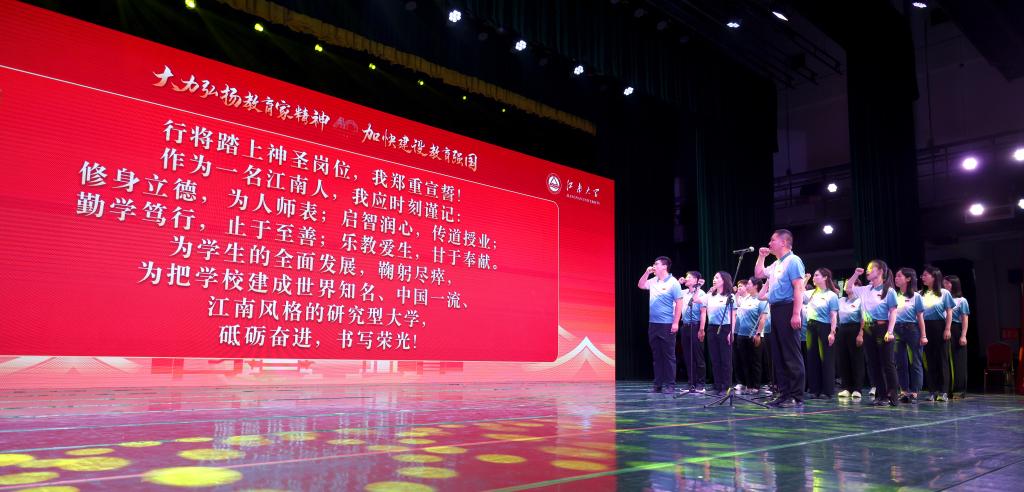 會(huì )議現場(chǎng)播放了教師節特輯視頻,學(xué)生集體詩(shī)朗誦《我們最可敬的江南人》,獻上節日祝福。大會(huì )現場(chǎng)設置了圖片直播,方便師生觀(guān)看。
