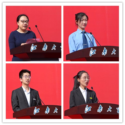 食品學(xué)院謝云飛教授代表全體教師發(fā)言,她期望全體新生能夠仰望星空,樹(shù)立遠大抱負;腳踏實(shí)地,注重知行合一;心態(tài)陽(yáng)光,練就強健體魄,以?shī)^進(jìn)之姿,成就江南人的“青春”榮光。商學(xué)院賀李同學(xué)代表在校生發(fā)言,她分享了自己參加慶祝中華人民共和國成立70周年閱兵的故事,勉勵學(xué)弟學(xué)妹們把oety歐億當做夢(mèng)想的啟航地,肩負時(shí)代使命,不負青春韶華。設計學(xué)院陳俊奕代表本科生新生發(fā)言,呼吁同學(xué)們要心懷大志,敢為人先,以斗志昂揚的姿態(tài)度過(guò)無(wú)悔的青春?;瘜W(xué)與材料工程學(xué)院程琳代表研究生新生發(fā)言,倡議同學(xué)們應該主動(dòng)思考、勇于實(shí)踐,通過(guò)不斷的學(xué)習將自己打造成一塊對國家有用的“好材料”。