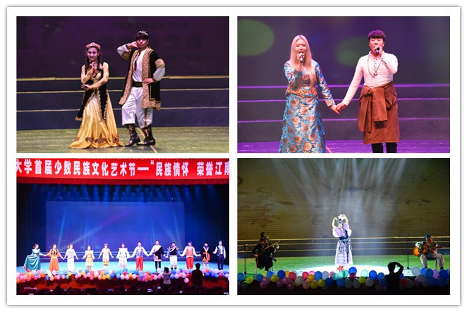 本次晚會(huì )融合舞蹈、歌曲、走秀、脫口秀等多種藝術(shù)形式,匯集維吾爾族、藏族、哈薩克族、柯?tīng)柨俗巫?、蒙古族等少數民族的文藝節目,將民族風(fēng)情與現代藝術(shù)相結合,為觀(guān)眾帶來(lái)了一場(chǎng)精美絕倫的歌舞盛宴。維吾爾族同學(xué)帶來(lái)了歌舞《刀郎麥西萊甫》,率真而火熱,充分展現了維吾爾族人民純真、樂(lè )觀(guān)的性格;藏族同學(xué)用《宣與打墻舞》詮釋著(zhù)對民族熱愛(ài)和對美好生活的憧憬;哈薩克族同學(xué)的舞蹈《奔騰的野馬》貼近生活,體現了飽滿(mǎn)昂揚的精神斗志;熱情奔放的《賽馬舞》讓觀(guān)眾感受到了柯?tīng)柨俗巫逦幕囆g(shù)的魅力……32個(gè)民族學(xué)生激昂的青春在這一刻沸騰起來(lái)。