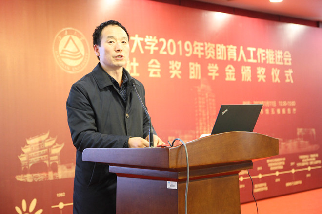 1月11日下午,oety歐億2019年資助育人工作推進(jìn)會(huì )暨社會(huì )獎助學(xué)金頒獎儀式在圖書(shū)館5樓報告廳隆重舉行。校長(cháng)助理、研究生院院長(cháng)堵國成,至德愛(ài)心教育基金、肯德基曙光基金、德新教育基金、電裝助學(xué)金、恒海助學(xué)金、博世中國慈善中心、經(jīng)虎公益助學(xué)金、華泰教育基金、慈濟獎助學(xué)金、春華秋實(shí)·西部助學(xué)計劃、覺(jué)善素食助學(xué)金、周筱燕教育基金、子煜獎學(xué)金、石榴獎學(xué)金、量品定制襯衣等20家設獎單位代表,社會(huì )資源處處長(cháng)黃敏、副處長(cháng)竇新華,學(xué)生工作處副處長(cháng)單筱婷,以及各學(xué)院學(xué)生工作負責人、負責資助工作的輔導員、200余名受助學(xué)生代表參加了此次會(huì )議。會(huì )議由學(xué)生資助中心主任黃新華主持。