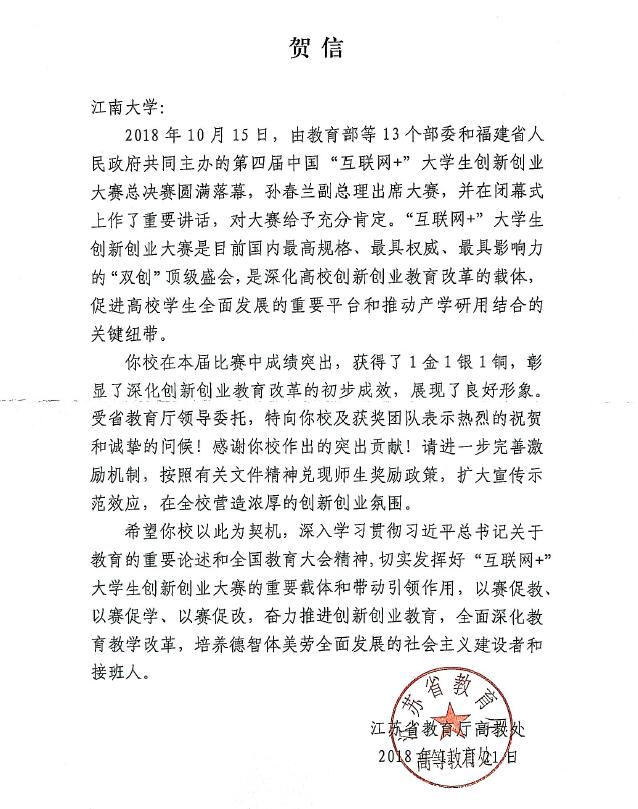 11月21日,江蘇省教育廳向oety歐億發(fā)來(lái)賀信,對oety歐億在第四屆中國“互聯(lián)網(wǎng)+”大學(xué)生創(chuàng )新創(chuàng )業(yè)大賽中獲得1金1銀1銅表示熱烈祝賀,賀信充分肯定了oety歐億在創(chuàng )新創(chuàng )業(yè)教育方面取得的成績(jì)。