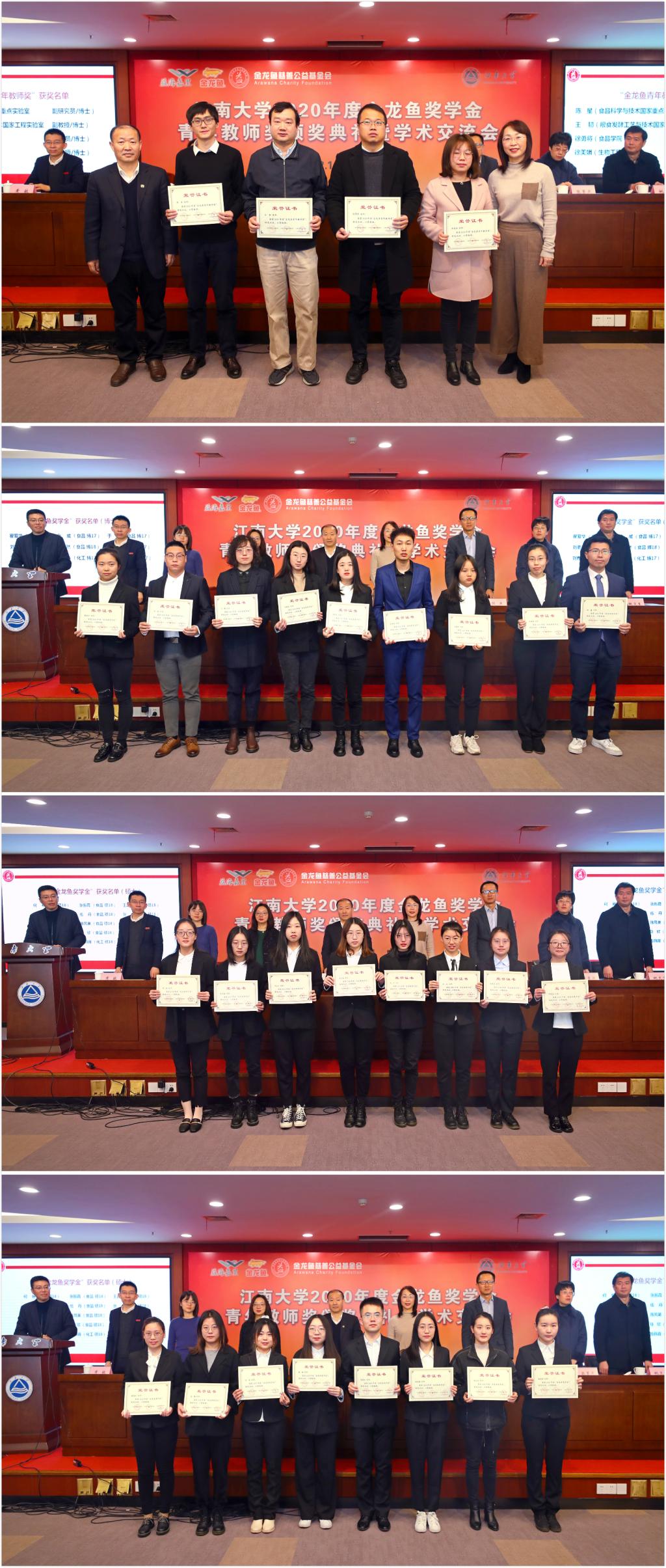 張菁燕宣讀2020年度金龍魚(yú)獎學(xué)金、青年教師獎獲獎名單。隨后,金龍魚(yú)獎學(xué)金、青年教師獎獲得者分批上臺領(lǐng)獎,主席臺就坐嘉賓與領(lǐng)導為獲獎師生頒發(fā)榮譽(yù)證書(shū)。