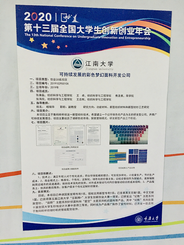 為培育優(yōu)秀項目,學(xué)生工作處修訂了《“大學(xué)生創(chuàng )新創(chuàng )業(yè)訓練計劃”項目管理辦法》,強化全過(guò)程管理。同時(shí),協(xié)同各學(xué)院積極開(kāi)展校內“國創(chuàng )計劃”項目的論文、成果遴選,并會(huì )同指導教師做好選送項目的材料準備和輔導提升工作。年會(huì )現場(chǎng),oety歐億理學(xué)院2017級光電信息科學(xué)與工程專(zhuān)業(yè)學(xué)生邢童璐代表年會(huì )入選論文作學(xué)術(shù)交流,創(chuàng )業(yè)訓練項目《可持續發(fā)展的彩色夢(mèng)幻面料開(kāi)發(fā)公司》進(jìn)行線(xiàn)上展示。