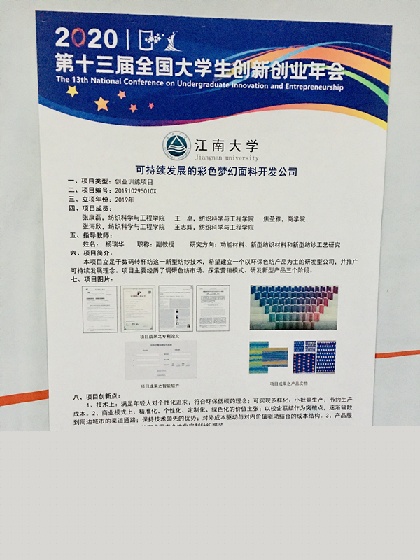 為培育優(yōu)秀項目,學(xué)生工作處修訂了《“大學(xué)生創(chuàng )新創(chuàng )業(yè)訓練計劃”項目管理辦法》,強化全過(guò)程管理。同時(shí),協(xié)同各學(xué)院積極開(kāi)展校內“國創(chuàng )計劃”項目的論文、成果遴選,并會(huì )同指導教師做好選送項目的材料準備和輔導提升工作。年會(huì )現場(chǎng),oety歐億理學(xué)院2017級光電信息科學(xué)與工程專(zhuān)業(yè)學(xué)生邢童璐代表年會(huì )入選論文作學(xué)術(shù)交流,紡織科學(xué)與工程學(xué)院創(chuàng )業(yè)訓練項目《可持續發(fā)展的彩色夢(mèng)幻面料開(kāi)發(fā)公司》進(jìn)行線(xiàn)上展示。