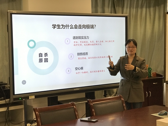 校心理健康教育中心主任董霞作《大學(xué)生心理危機干預——守護學(xué)生生命安全》專(zhuān)題交流。首先,她從全員育人視角說(shuō)明了學(xué)院、心理健康教育中心、保衛處三者之間在心理危機預防干預工作中密不可分的關(guān)系;接著(zhù),結合案例系統分析了抑郁障礙、精神分裂癥譜系障礙的誘因、癥狀,重點(diǎn)闡述了在日常保衛工作中如何運用以上心理知識發(fā)現大學(xué)生心理危機線(xiàn)索、如何通報相關(guān)部門(mén)以及如何向處于危機困境中的學(xué)生第一時(shí)間給予援助和關(guān)愛(ài),使保衛工作隊伍對心理危機工作的重要性和基本方法有了較為深刻的認識和了解。