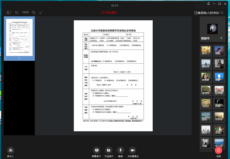 近日,學(xué)生資助中心以企業(yè)微信會(huì )議形式,召集學(xué)院學(xué)生資助工作輔導員,就新學(xué)年家庭經(jīng)濟困難學(xué)生復核認定工作開(kāi)展線(xiàn)上研討交流。全校17個(gè)學(xué)院的資助工作輔導員全數參會(huì ),會(huì )議由學(xué)生資助中心主任黃新華主持。