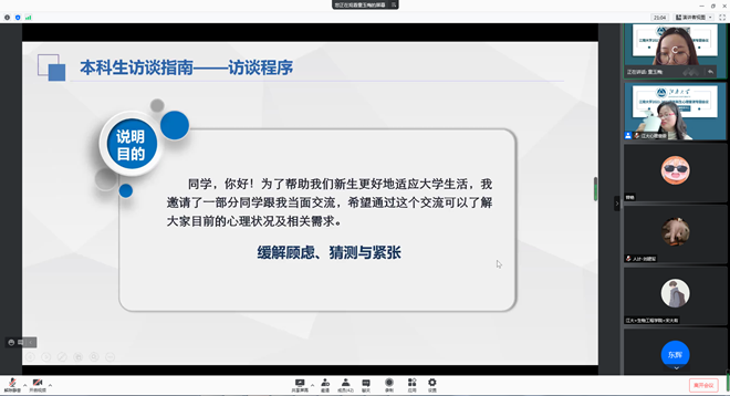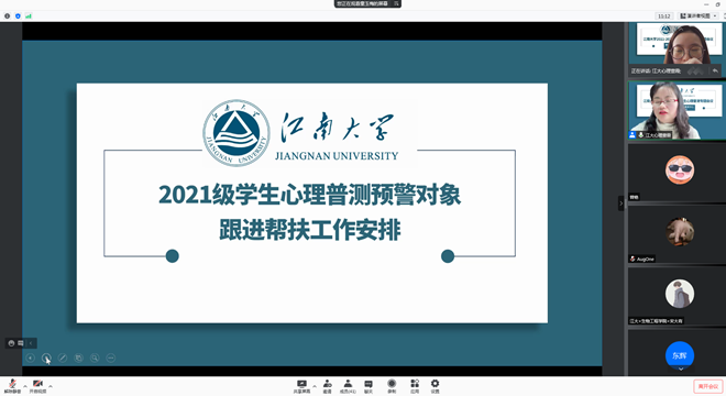 講座后,學(xué)生工作部線(xiàn)上舉行了新生心理普測專(zhuān)題會(huì )議。心理健康教育中心董霞通報了2021級學(xué)生心理測試總體情況,提出了心理測試預警學(xué)生幫扶工作的要求。童玉梅詳細講解了針對本科生預警學(xué)生和研究生預警學(xué)生的約談流程,以及約談的注意事項。會(huì )議簡(jiǎn)短而高效,促進(jìn)了心理健康工作隊伍專(zhuān)業(yè)知識和實(shí)踐經(jīng)驗的交流,有利于掌握學(xué)生心理健康狀況,有針對性地開(kāi)展心理危機干預,形成全員育人工作格局。