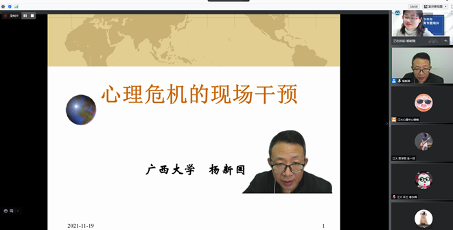 培訓開(kāi)始,廣西大學(xué)心理健康研究所所長(cháng)楊新國研究員線(xiàn)上作《危機的現場(chǎng)干預》講座。楊老師結合多年危機干預的工作經(jīng)驗及深厚的理論功底,著(zhù)重介紹了10項干預技術(shù),包括借助姓名建立關(guān)系、傾聽(tīng)和共情、發(fā)現社會(huì )支持系統、詢(xún)問(wèn)未完成事件等。楊老師指出,在現場(chǎng)干預中,也需要杜絕14項很容易犯的錯誤,如批評指責、討論對錯、忘記跟蹤記錄等。最后,楊老師通過(guò)一個(gè)真實(shí)的危機案例,詳細講解了危機干預中的各項技術(shù)和注意要點(diǎn)。楊老師溫文爾雅、妙語(yǔ)連珠,講座深入淺出、實(shí)操性強,使參訓老師對危機干預工作有了更加全面的認識和理解。