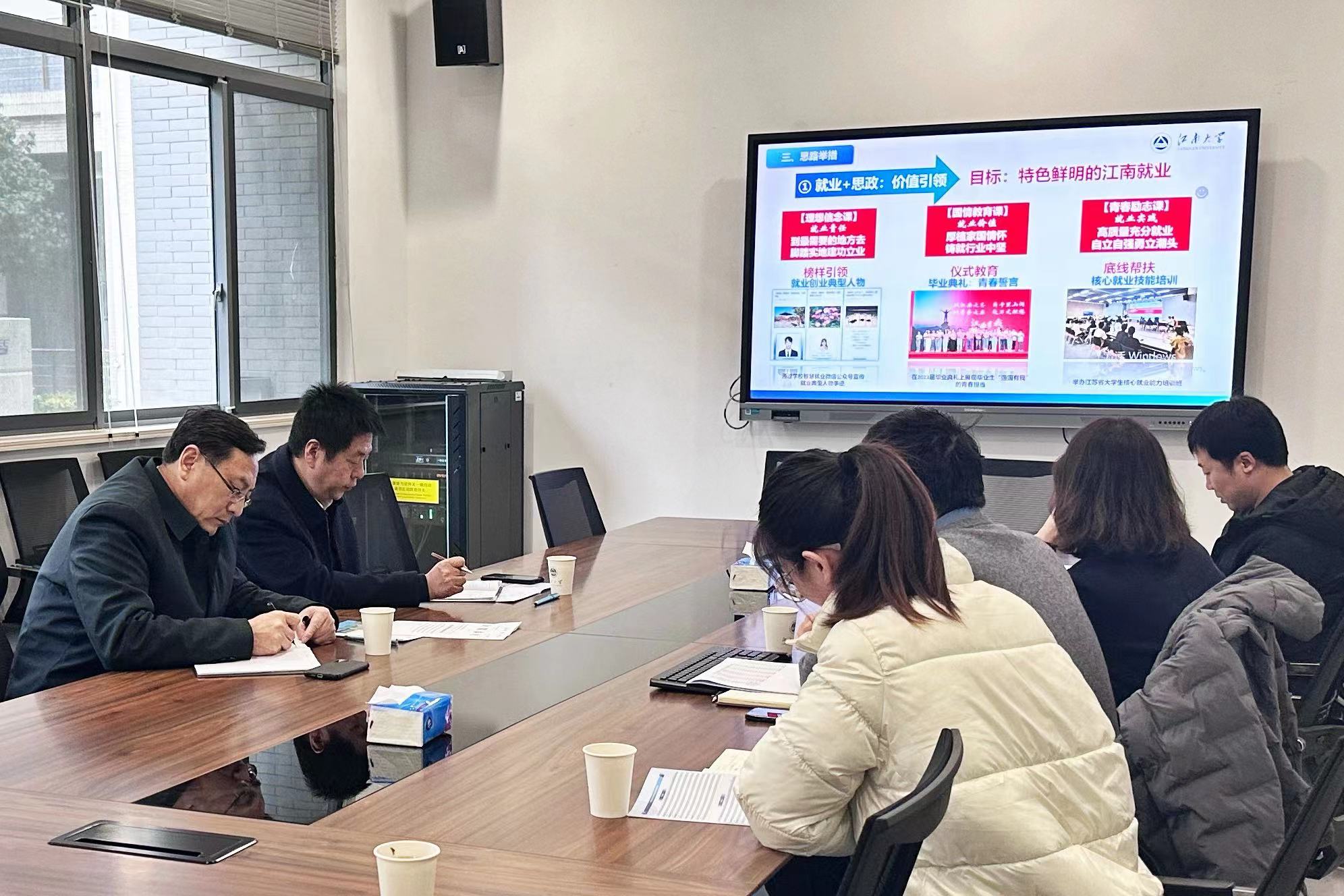 倪松濤結合匯報內容提出,高校就業(yè)工作事關(guān)經(jīng)濟社會(huì )高質(zhì)量發(fā)展、事關(guān)社會(huì )和諧穩定,作為高校就業(yè)管理部門(mén),要肩負使命、直面挑戰,多措并舉服務(wù)畢業(yè)生高質(zhì)量充分就業(yè)。他指出,一是要引導大學(xué)生樹(shù)立正確的擇業(yè)觀(guān)、就業(yè)觀(guān),明確求職目標,提高大學(xué)生就業(yè)創(chuàng )業(yè)主動(dòng)性;二是要通過(guò)優(yōu)化專(zhuān)業(yè)設置、拓展實(shí)習實(shí)訓、加強創(chuàng )業(yè)教育、引導深造升學(xué)等不同路徑力促高質(zhì)量就業(yè);三是要加強校地區域聯(lián)動(dòng),鼓勵學(xué)生留錫就業(yè)創(chuàng )業(yè),服務(wù)地方經(jīng)濟社會(huì )發(fā)展。